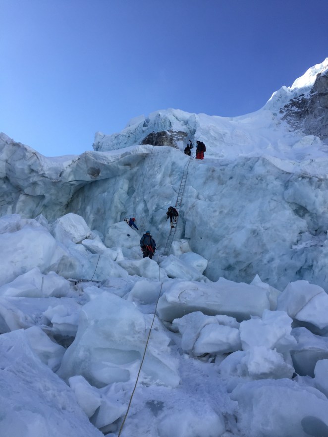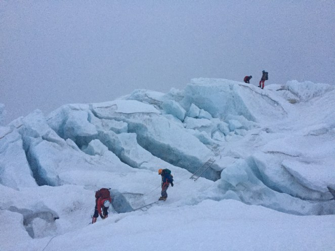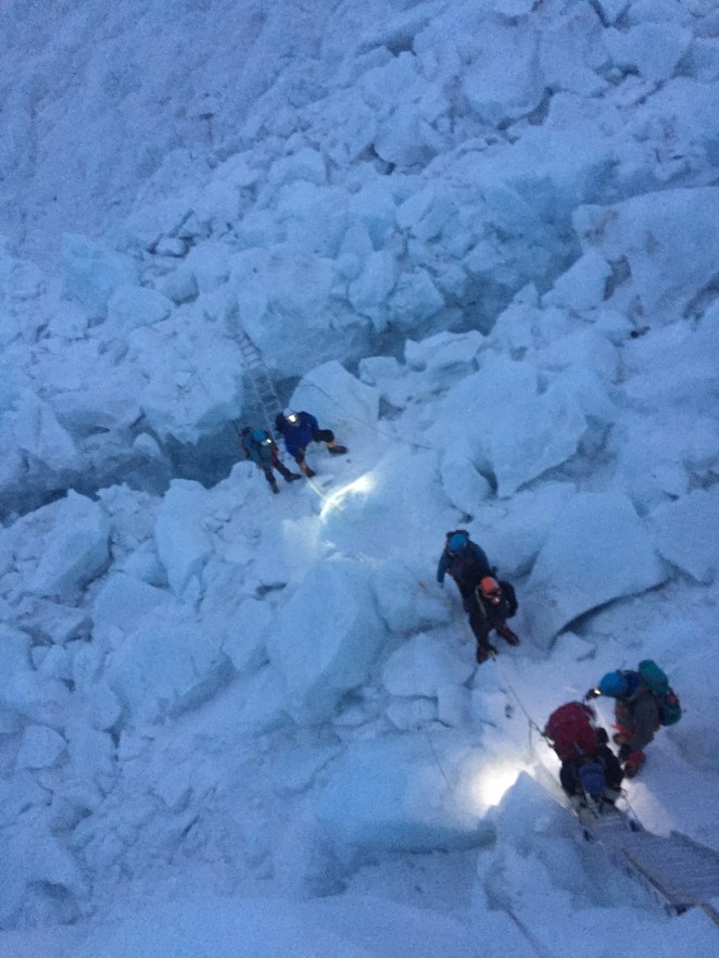 So, first impressions of the icefall – definitely as unique an experience as I was led to believe from friends who have been here before. Thankfully, not quite as daunting as I expected – although given my imagination, reality is rarely worse than my imagined worst case scenario! We did have some spans utilizing ladders – several horizontal (1 ladder wide) and one vertical (2 ladders high) – but none particularly hair-raising. We traveled through the icefall during the night as with the cold temperatures, the frozen bonds keeping the icefall together are more intact than during the day, hence there is less chance of an avalanche. Happy to report this proved the case for us, but there were definitely more than a few spots where the Sherpa advised us to traverse quickly due to increased exposure to potential objective hazard.