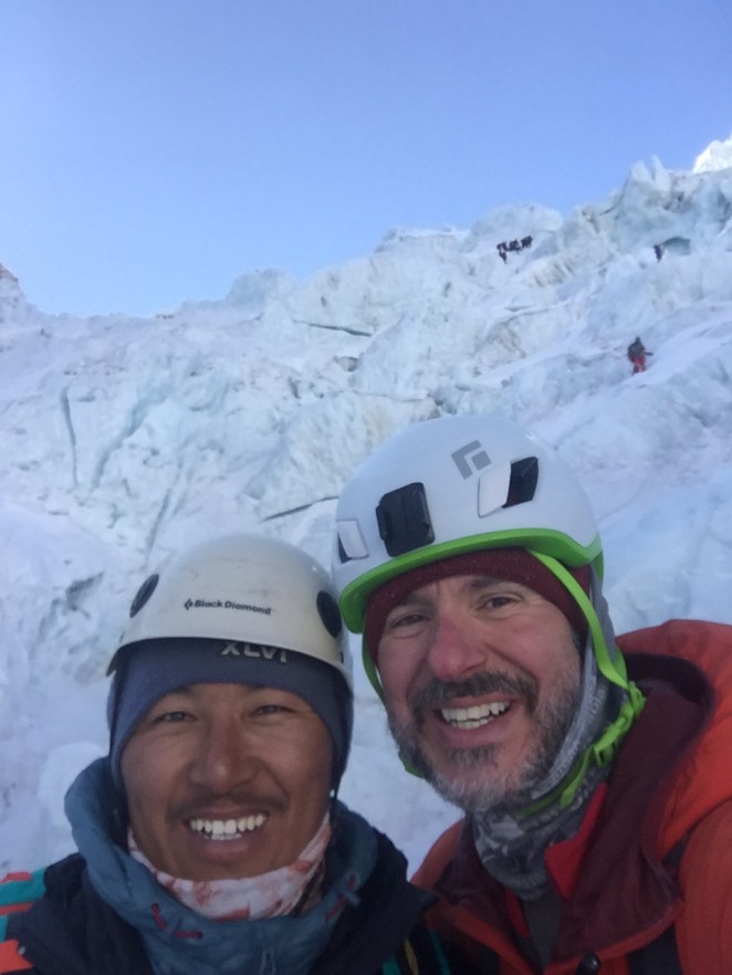 My Sherpa for the day – Sonam (Jangbu) was just as good as Mingma was on Lobuche. He motored up the icefall, all the while paying attention to my every move, providing advice on each section and offering encouragement at every turn. Seriously – these guys have the patience of saints! He set a pace just on the edge of comfort that had my thought process fluctuate from “ok I can do this” to “shit, I am not sure how long I can keep this up” and then back to “thank god, caught my breath – ok to go for another bit”!! Sonam tells me that I was strong for my first time in the icefall – I know these guys aren’t much for BS – but I still don’t know whether to believe him! I didn’t feel very strong. Let’s see how next time goes.