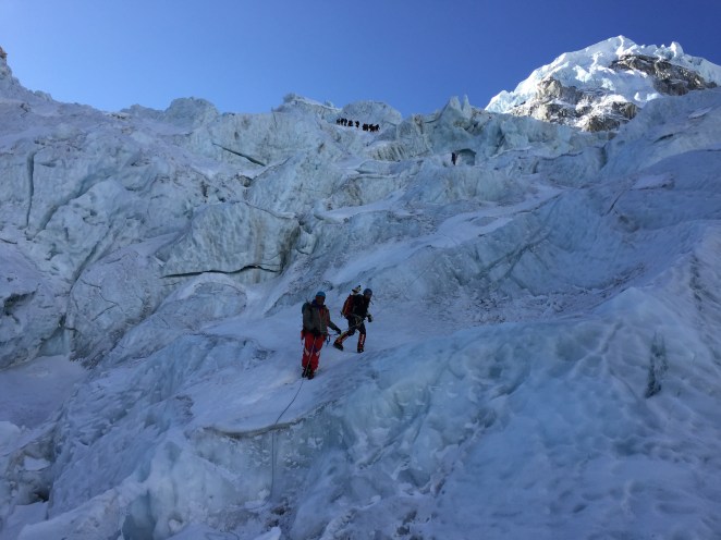 After about 3 hours in we arrived at the end of our upward motion for the day – a location called the “football field” – approx 1,500 feet above EBC – a large and relatively stable section of ice. Here we took our bearings, enjoyed the view – as it was now daylight – and eventually turned around and headed back down to EBC.
