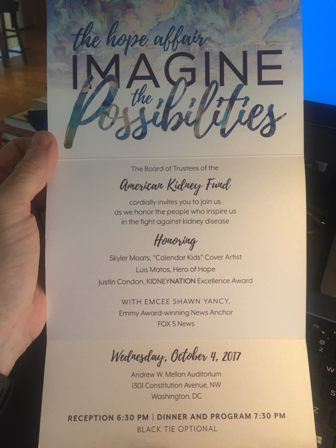 Wanted to share this bit of news with you folks who so generously supported my cause this year. The American Kidney fund host their annual charity gala down in D.C. and this year is entitled “The Hope Affair”.