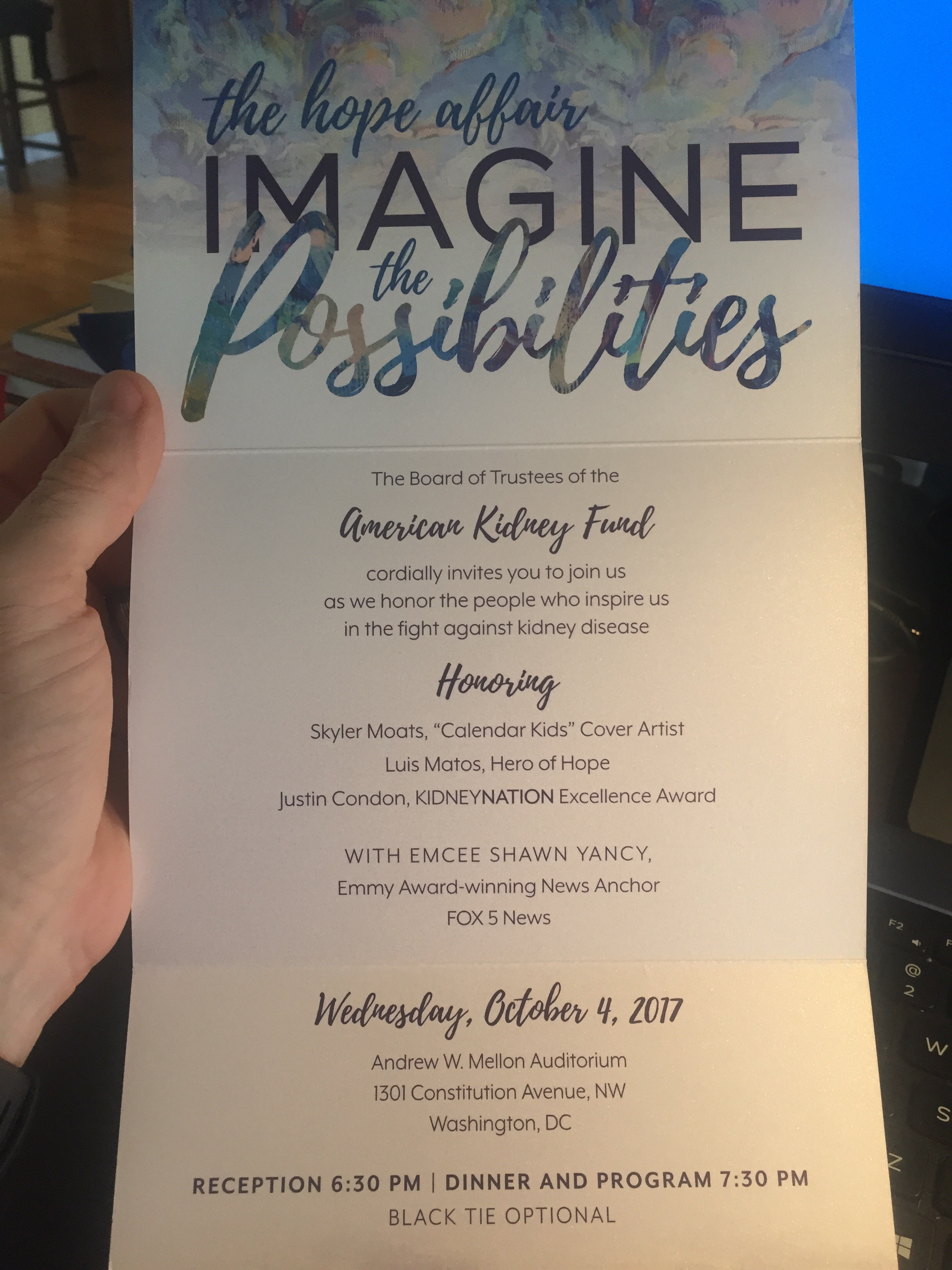 Wanted to share this bit of news with you folks who so generously supported my cause this year. The American Kidney fund host their annual charity gala down in D.C. and this year is entitled “The Hope Affair”.