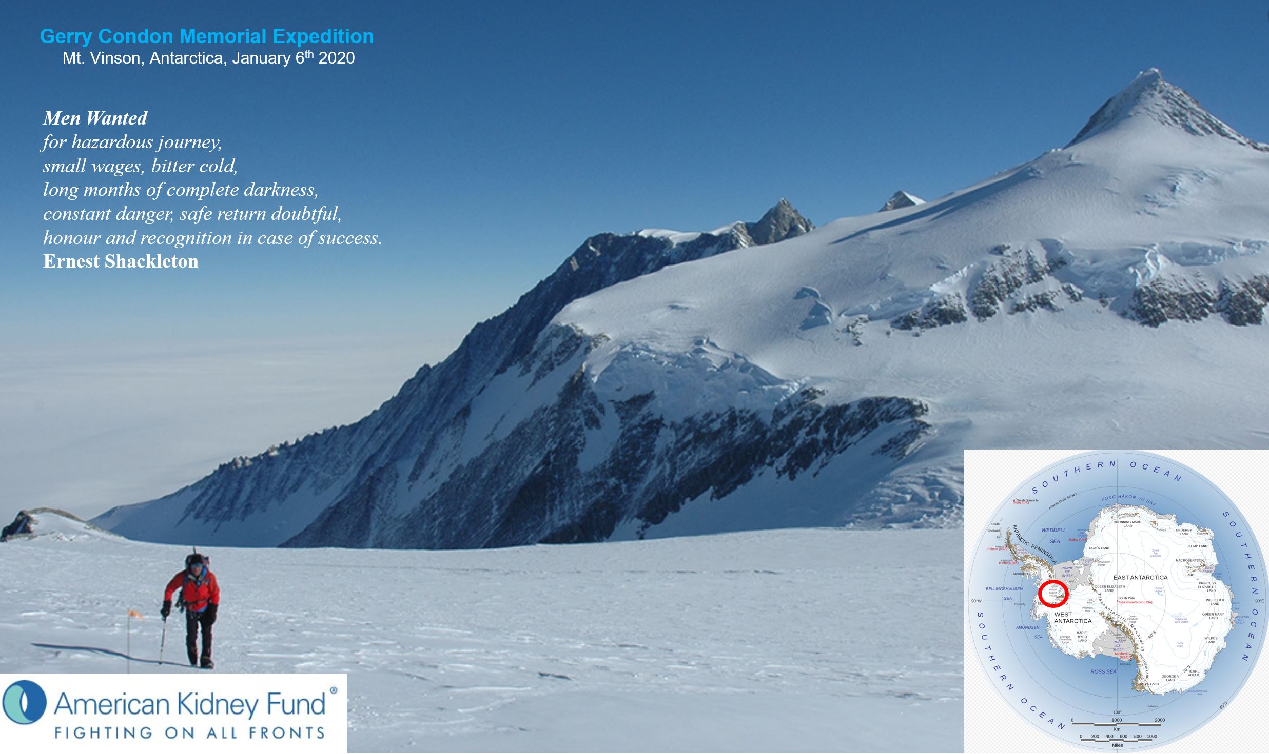 It is with this in mind, and a desire to continue to support not only the charity of choice helping people with kidney disease, but also consistently ranked as one of the top charities period, that I am once again fundraising in Dad’s honor for the American Kidney Fund. This time round, calling this the Gerry Condon Memorial Expedition – Mt. Vinson Edition – and hoping for a little more luck and a little less drama than last time you followed my climb on Mt. Everest.