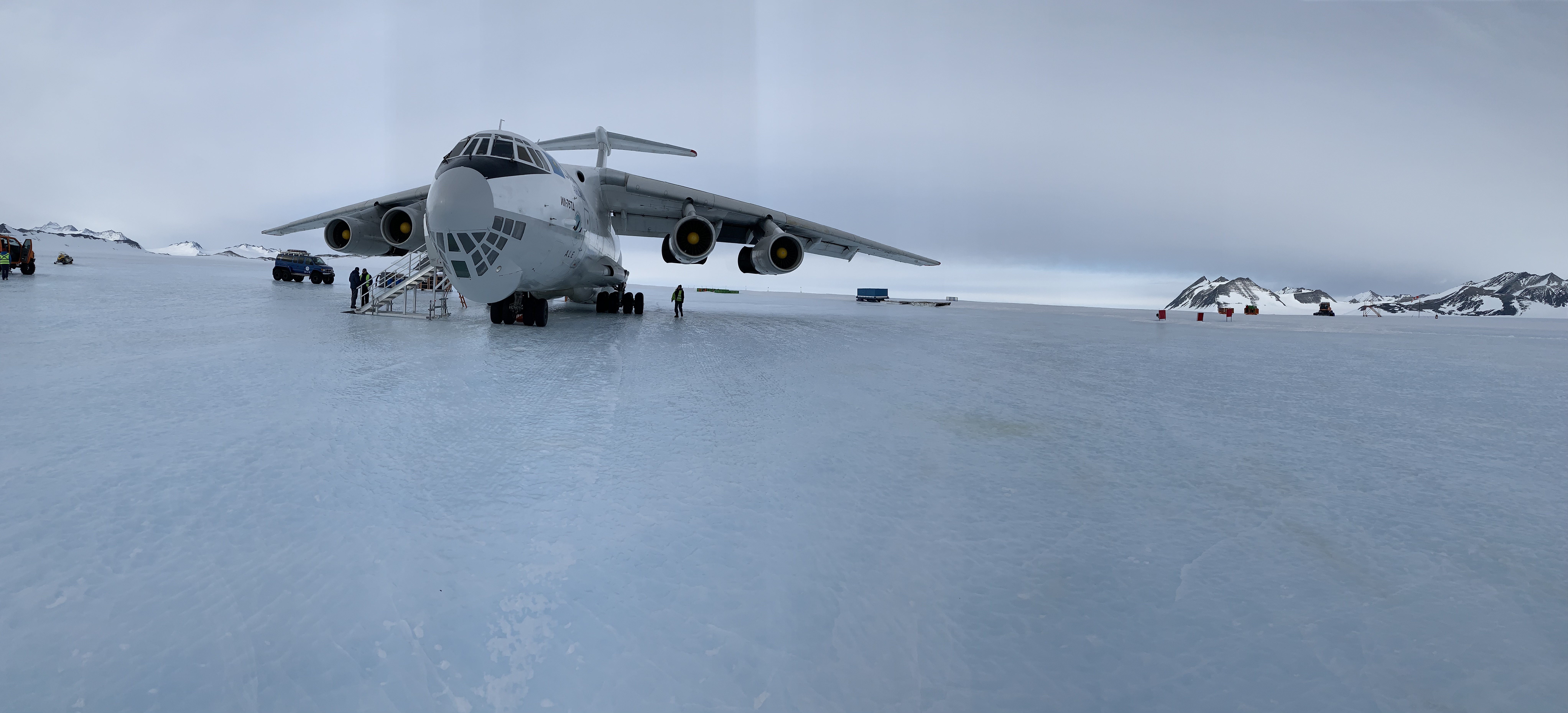 We were instructed not to take any photos while being bused out to the Ilyushin plane (Punta doubles as a military air base), owned by ALE (Antarctic Logistics & Expeditions – a crew that runs all of the logistics and operations for climbers, trips to the South Pole, trips to the coast to see Emperor penguin colonies, trans-Antarctic expeditions, etc.) – so our first glimpse was somewhat muted (see photo below) which I took when later flying out of Punta after the expedition – as the Ilyushin was parked away from the immediate terminal area.