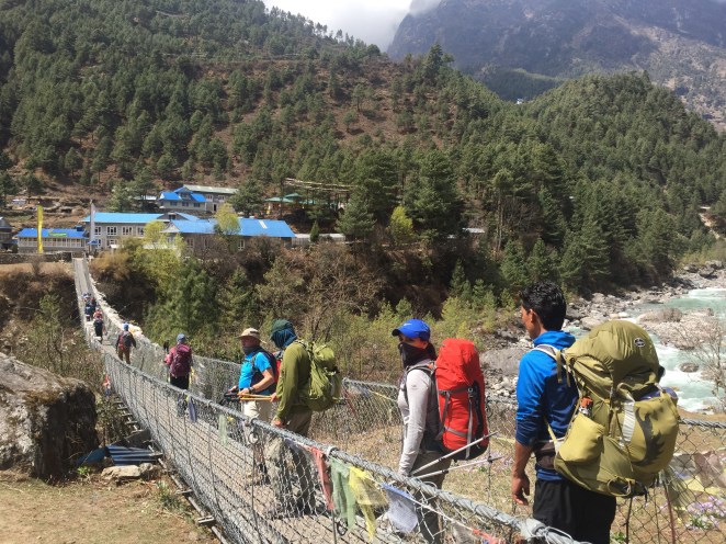 Day 2 (Friday) was spent trekking further up the valley to the local commercial hub, the town of Namche Bazaar. This involved crisscrossing the Dudh Kosi (milky) river, crossing several cable bridges – which anyone who has seen the movie “Everest” will recognize.