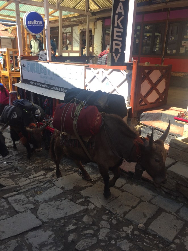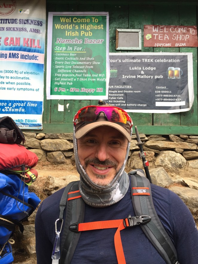 The town of Namche is a remarkable spot, at approx. 11,200 feet, built into a hillside like an amphitheater, with a huge drop off into the valley and a mountain buttress where the stage would be. This town is aptly named as it is renowned for its market or Bazaar, where traders from the locale and across the border in Tibet journey to sell their wares. And, as it turns out – home to the highest altitude Irish pub in the world… we Irish are everywhere!