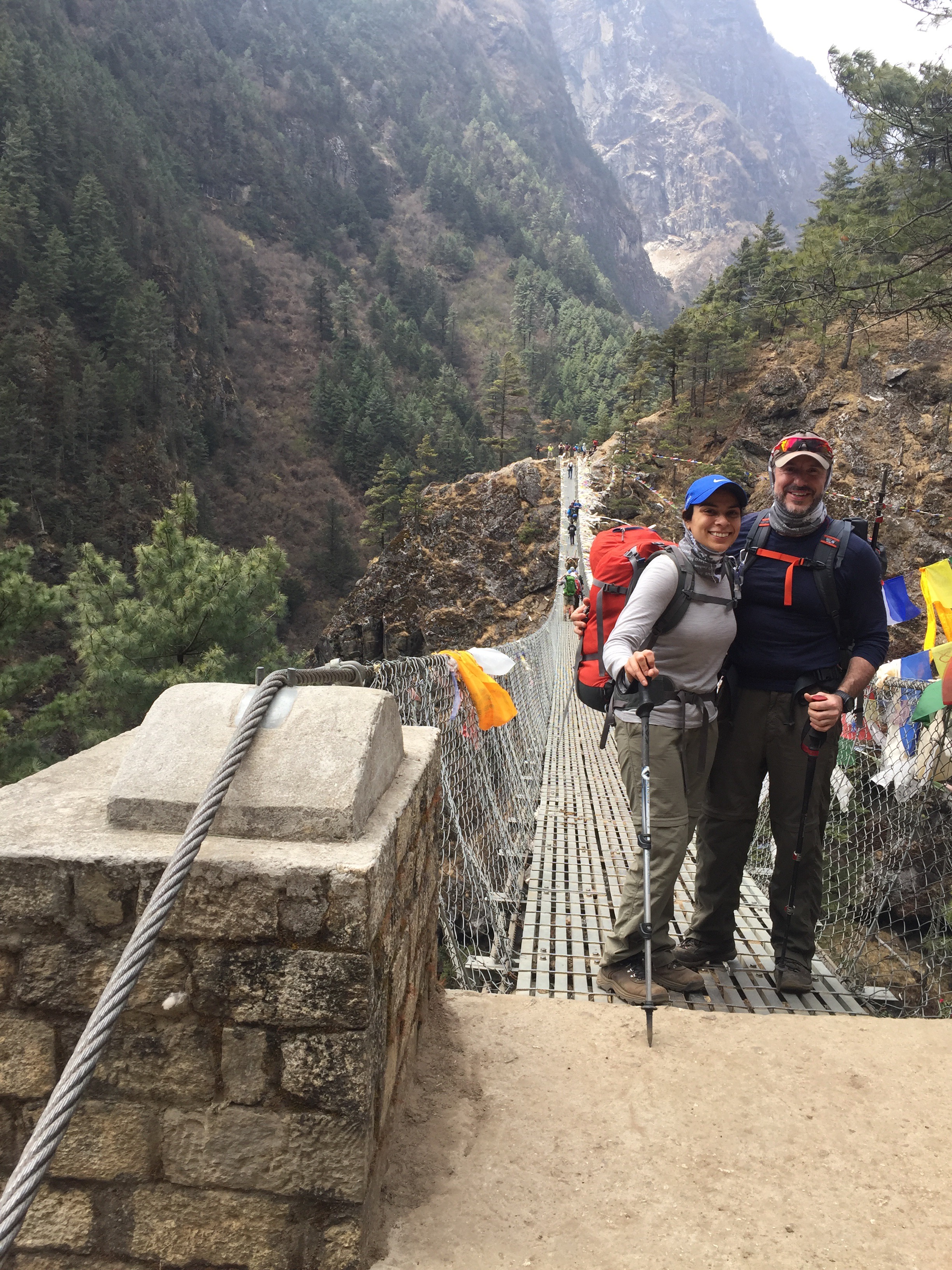 Day 2 (Friday) was spent trekking further up the valley to the local commercial hub, the town of Namche Bazaar. This involved crisscrossing the Dudh Kosi (milky) river, crossing several cable bridges – which anyone who has seen the movie “Everest” will recognize.